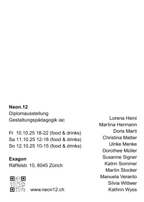 Die Diplomand*innen der Ausbildung Gestaltungspädagogik iac präsentieren ihre Jahresarbeiten vom 10. bis 12. Oktober 2025 im Exagon Zürich.